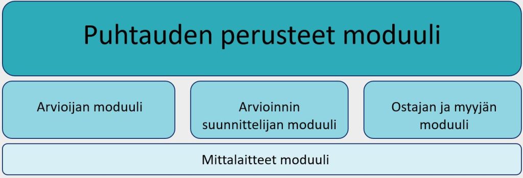 Puhtauden perusteet moduuli suoritetaan Puhtausala ry.n verkkokoulutuksena, koulutus sisältää teoriakokeen. Koulutus tulee olla suoritettu hyväksytysti läpi ennen seuraavan moduulin koulutusta.